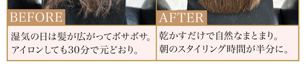 湿気で広がらず、清潔感のある「面で整ったツヤ」が日常になります。ベタつく作り物の輝きではなく、根元はふんわり、毛先はしっとり。ふとした瞬間の横顔まできれいに見え、周囲に品のある印象を与えます。