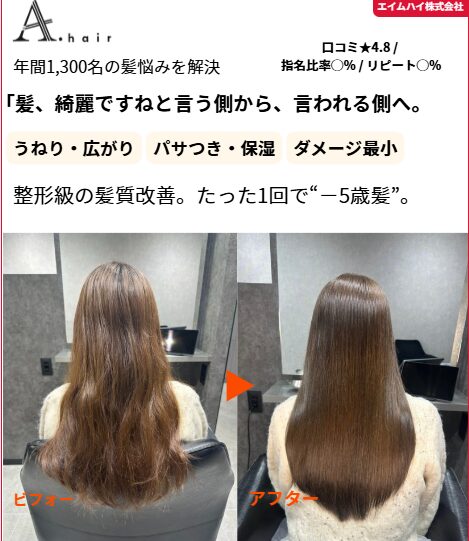 A.hairの髪質改善は、縮毛矯正なし内側に栄養を与え本来のうるおいを取り戻す設計。