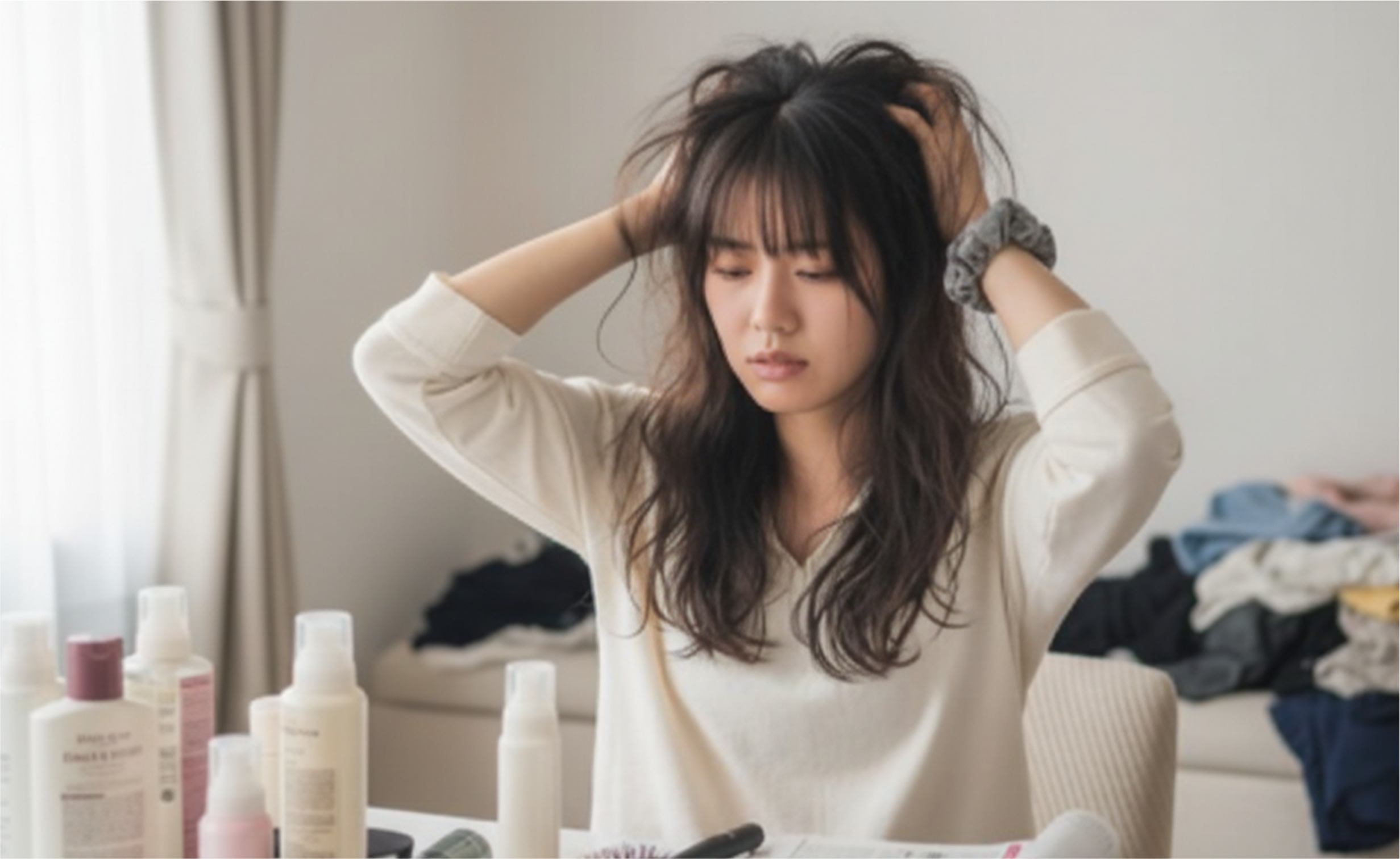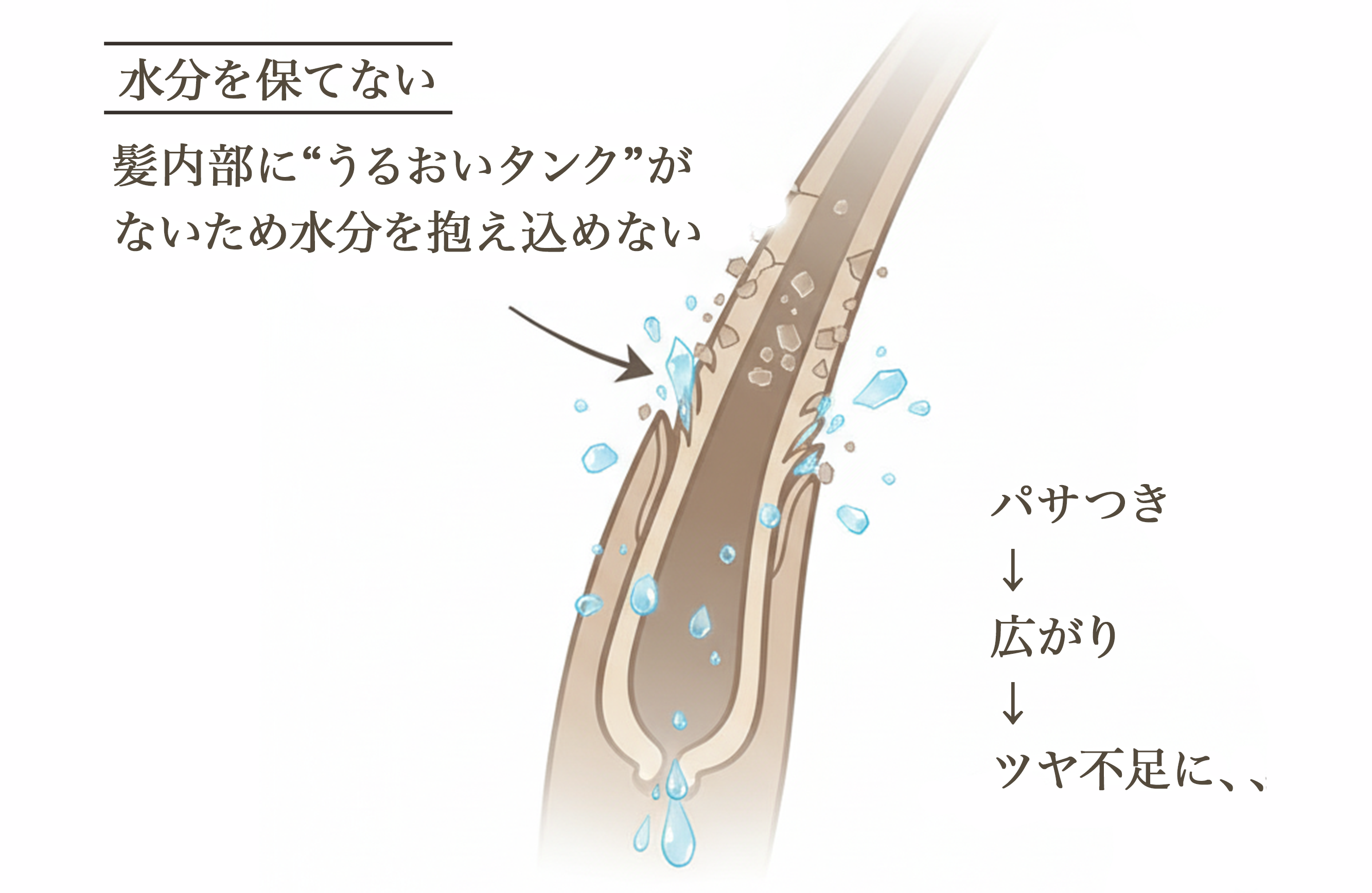 ➡ 髪内部に“うるおいタンク”がないため水分を抱え込めず、パサつき→広がり→ツヤ消失の坂道を転がり落ちてしまいます。
