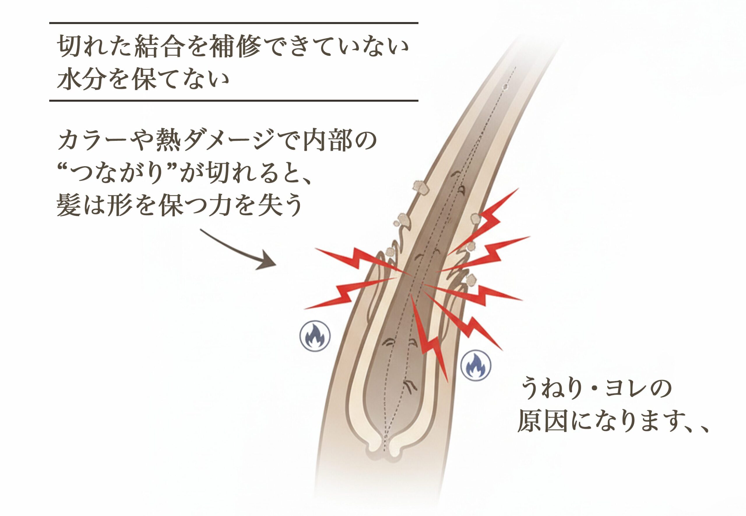 ➡カラーや熱ダメージで内部の“つながり”が切れると、髪は形を保つ力を失い、うねり・ヨレとなって現れます。