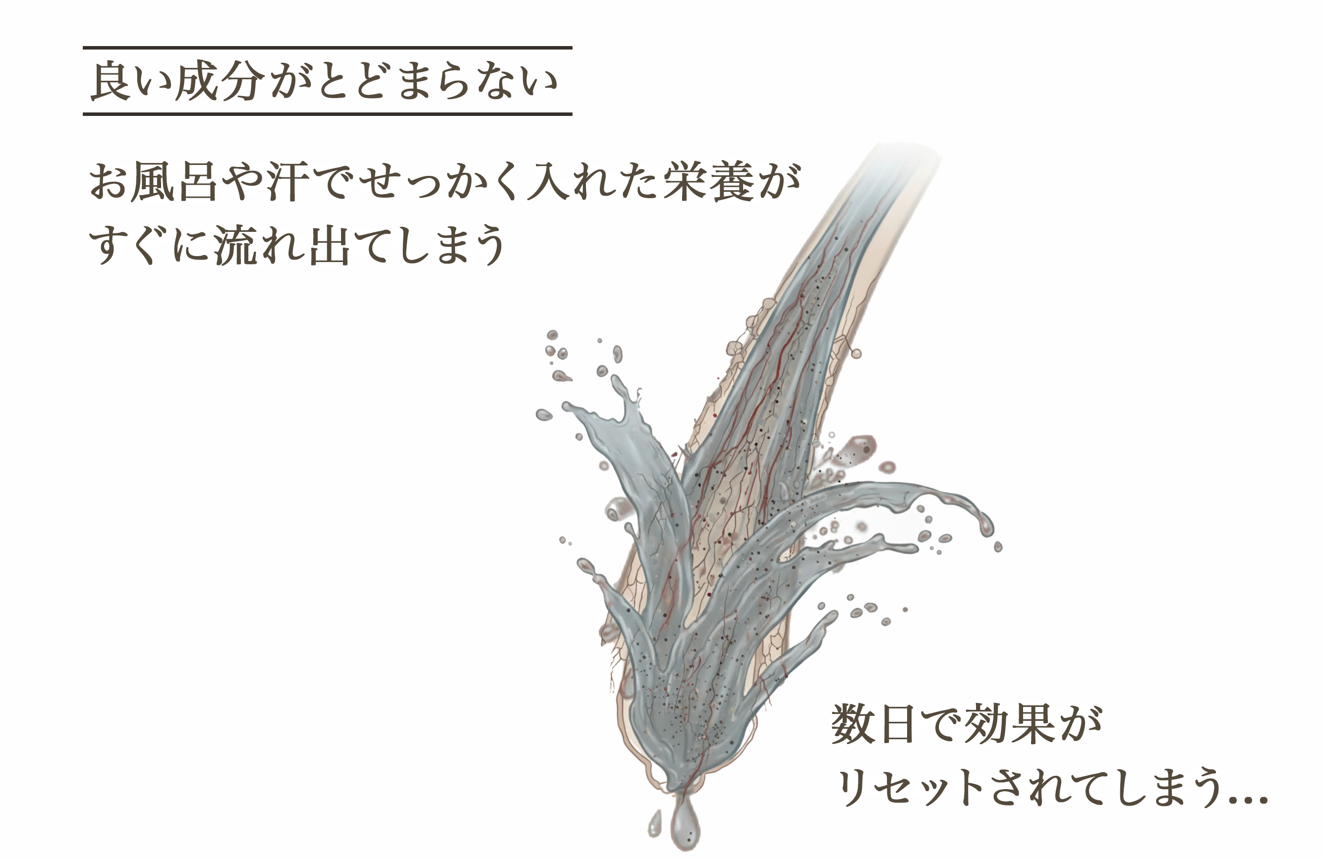 ➡多くのトリートメントは水に溶けやすい「水溶性」。お風呂や汗でせっかく入れた栄養がすぐに流れ出てしまい、数日で効果がリセットされてしまうのです。
