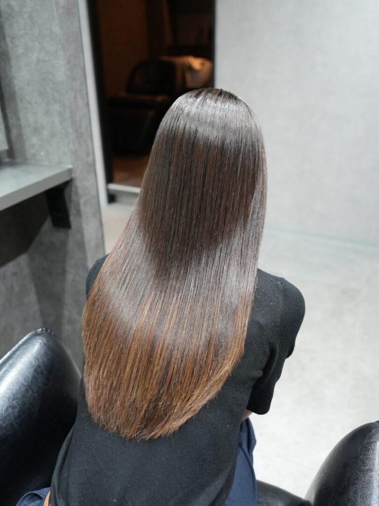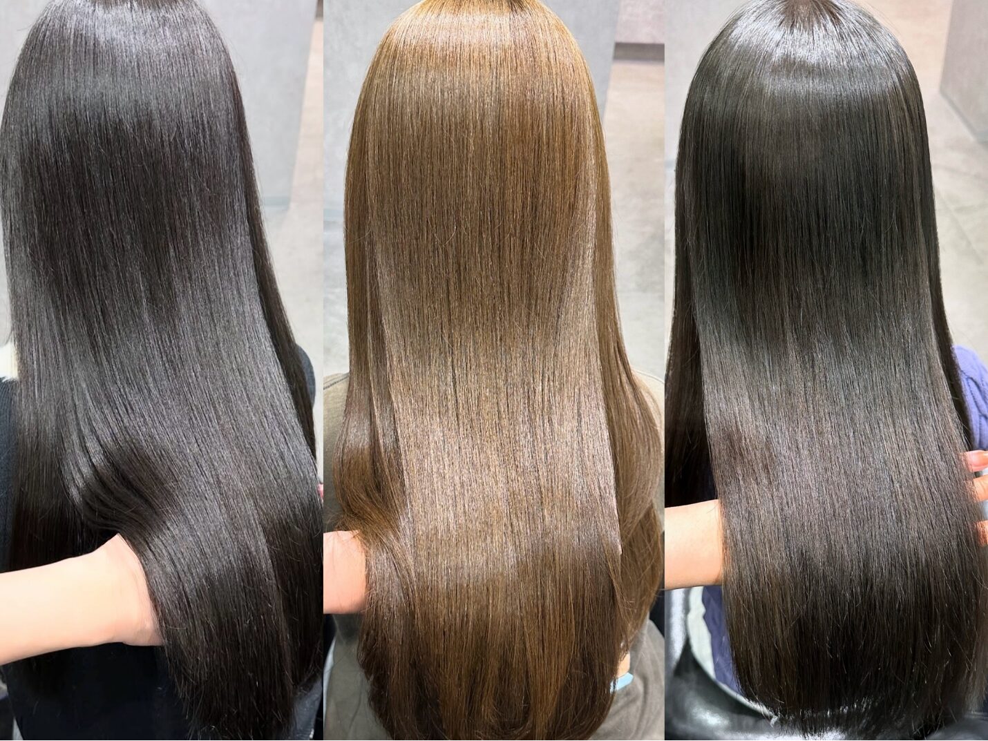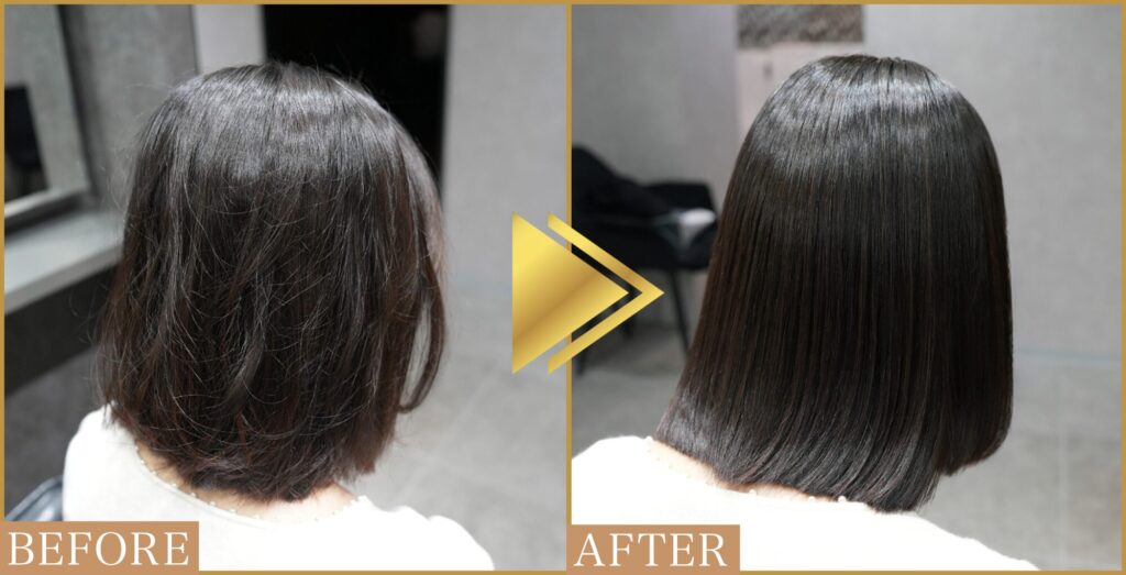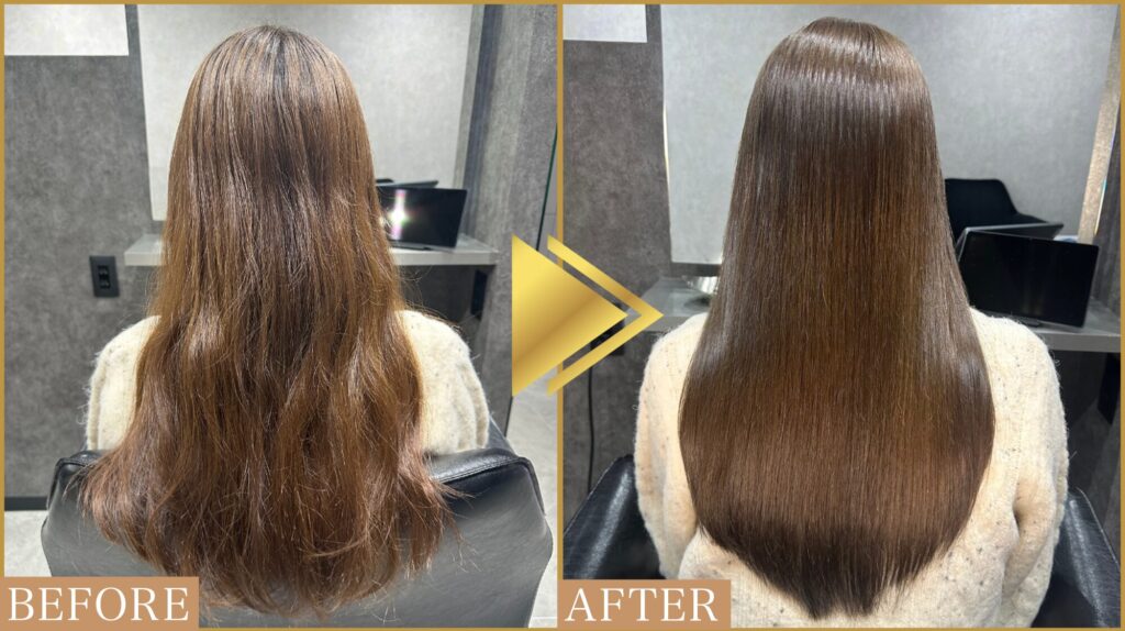 表面コーティングではなく“中身から”整える点です。縮毛矯正や高温アイロンを使わずに、シャンプー後も落ちにくい美髪の土台をつくり、ご自宅での再現性を最も重視しています。
