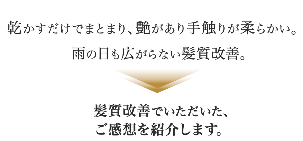 > ガサガサの毛先でブラシが止まる無限ループ。もう切るしかないと諦めていましたが、ここの説明を聞いてダメ元でトライ。3日後でも手触り良くブラシが止まらなかったので、『これは施術直後だけを取り繕うものじゃない』と確信しました。