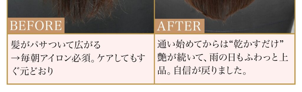 年間施術実績1,300名以上。「ダメージ」「パサつき」「広がり」「アホ毛」「ツヤ不足」「うねり」で本気でお困りの女性たちが、自分史上最高の美髪を手に入れています。