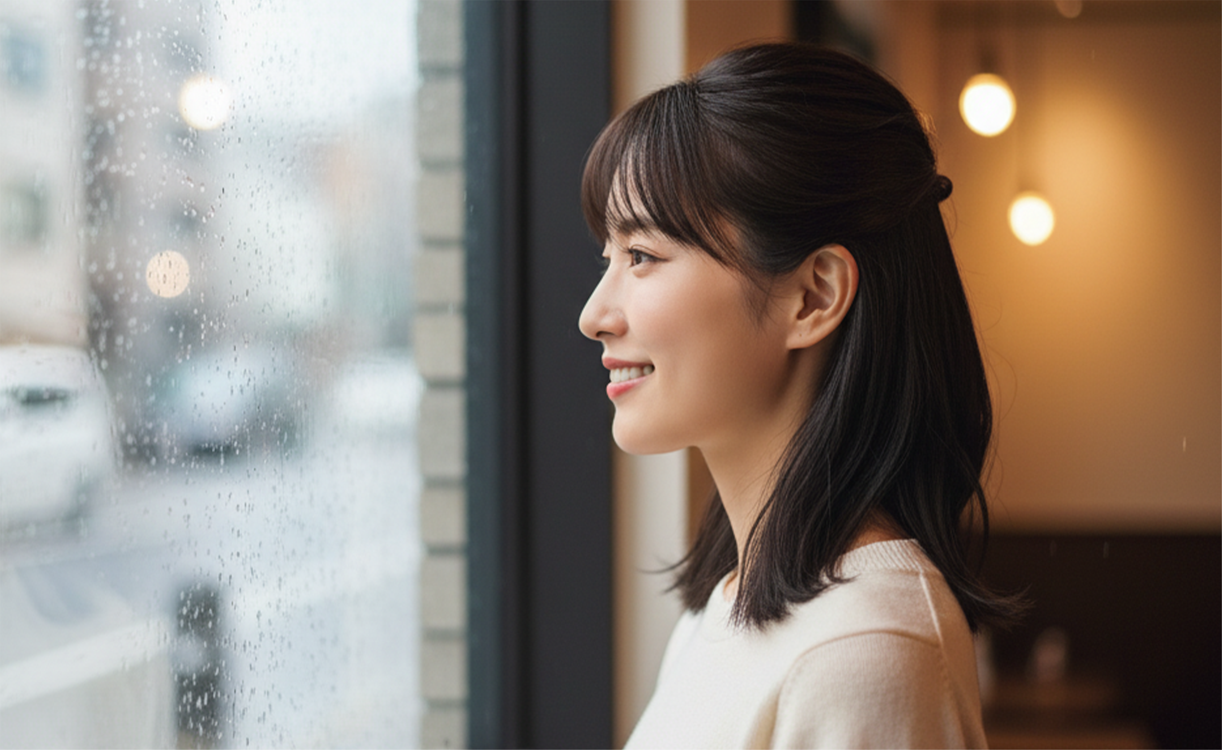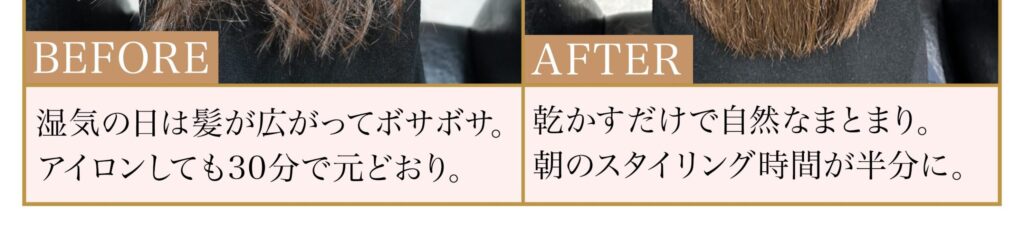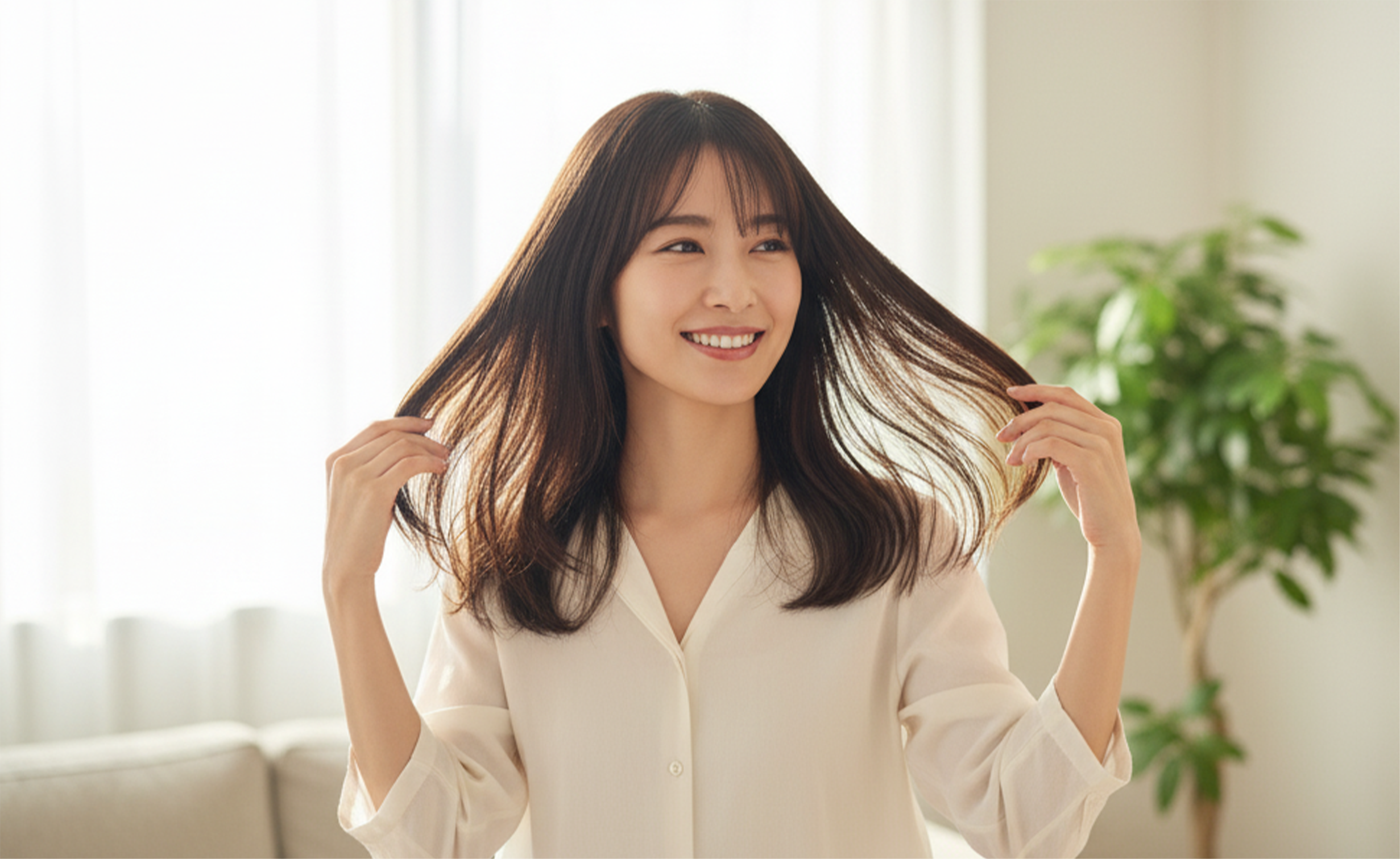 湿気で広がらず、清潔感のある「面で整ったツヤ」が日常になります。ベタつく作り物の輝きではなく、根元はふんわり、毛先はしっとり。ふとした瞬間の横顔まできれいに見え、周囲に品のある印象を与えます。